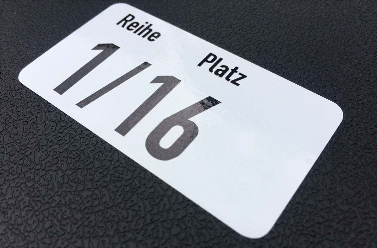 Wir drucken und produzieren Stuhlnummern auch gern mit Ihrem Logo auf haltbarer Folie, bringen diese an und entfernen diese nach der Veranstaltung auch wieder.